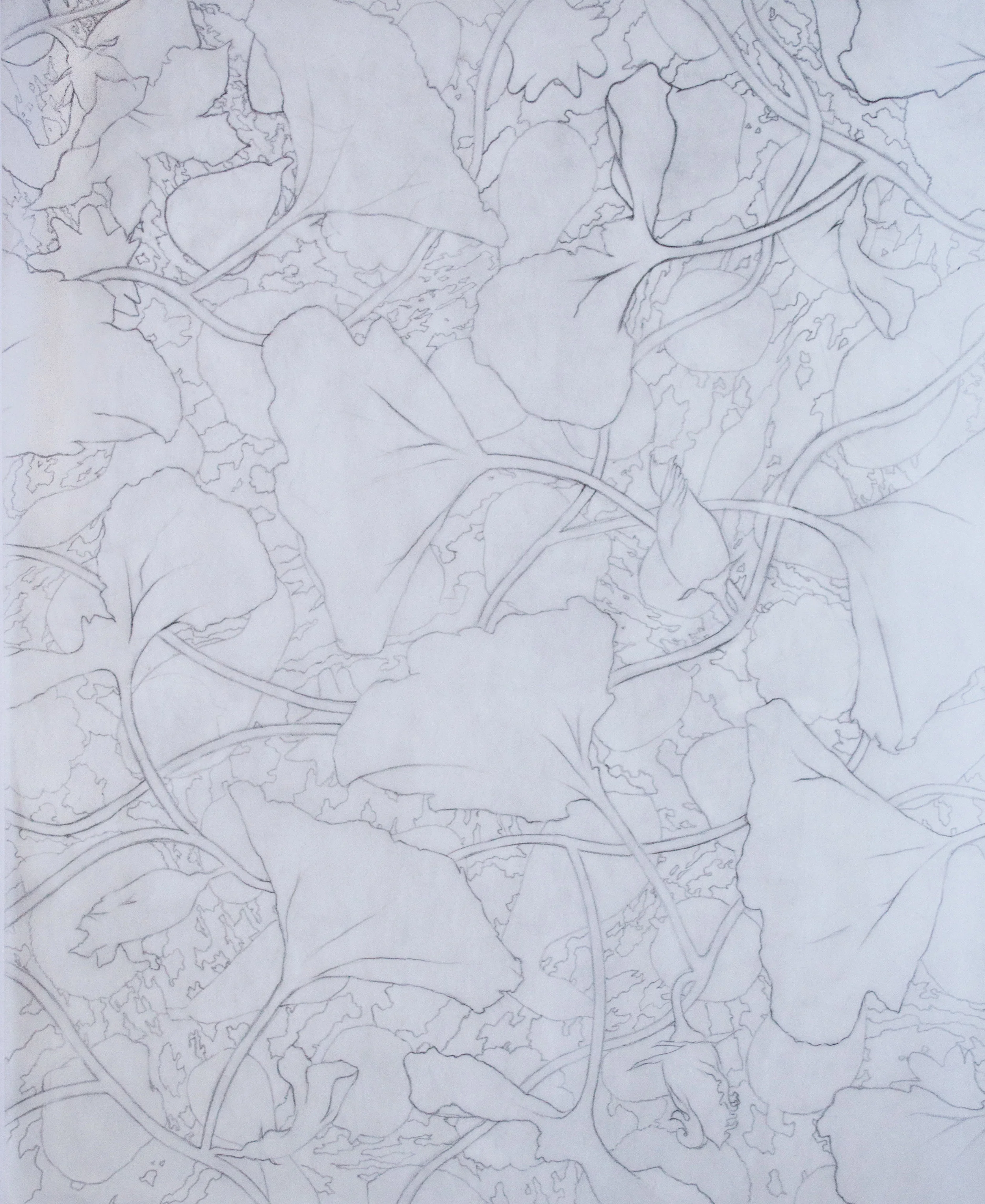 You can see influences from the mood board here - squash blossoms, vines and leaves, and squash skin patterns in the far background. Do you also see the squash silhouettes?