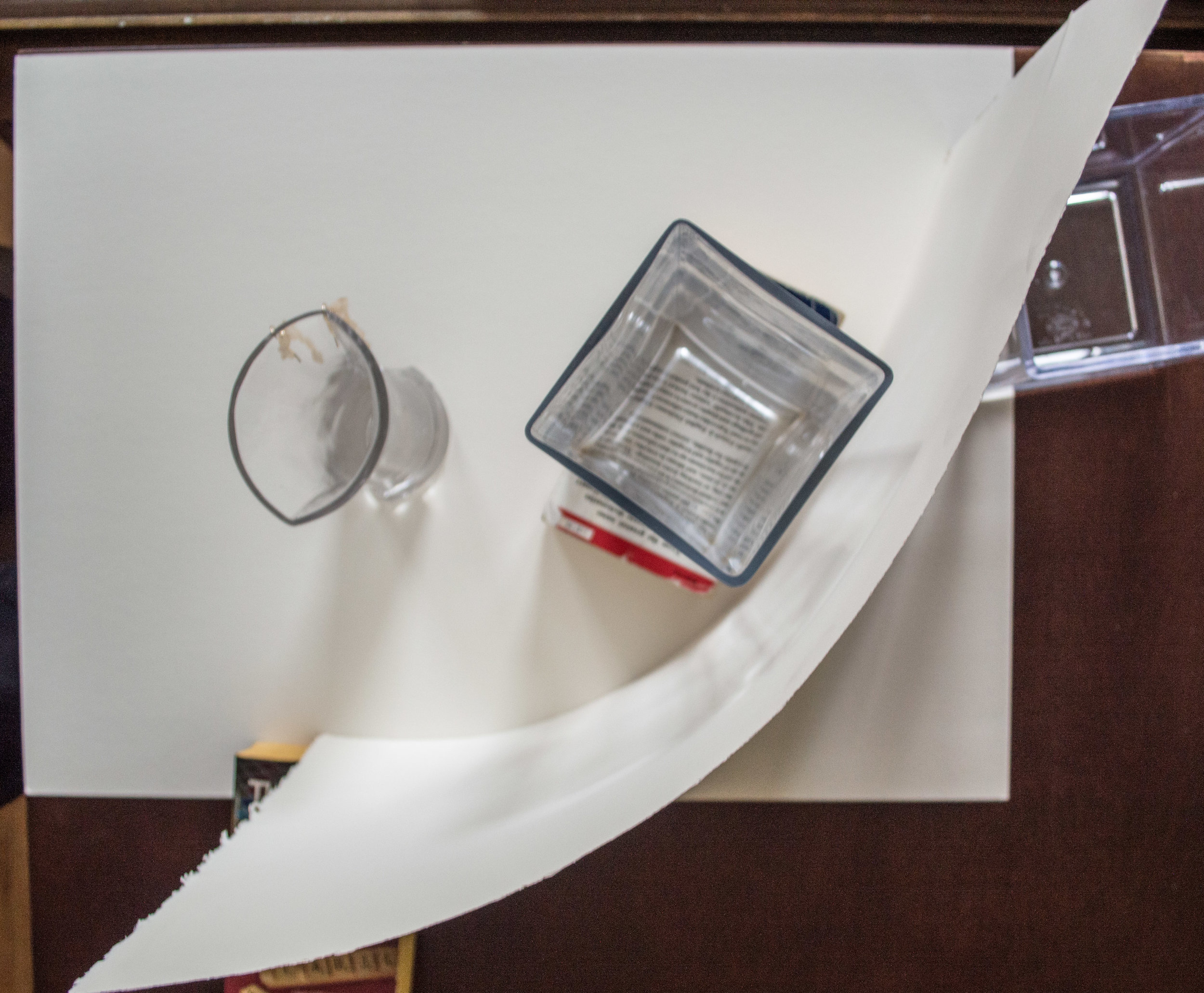Similar setup, as seen from above. Instead of shooting into the window, this time I'm shooting perpendicular to the window, with glass-in-front-of-white-paper as the backdrop.