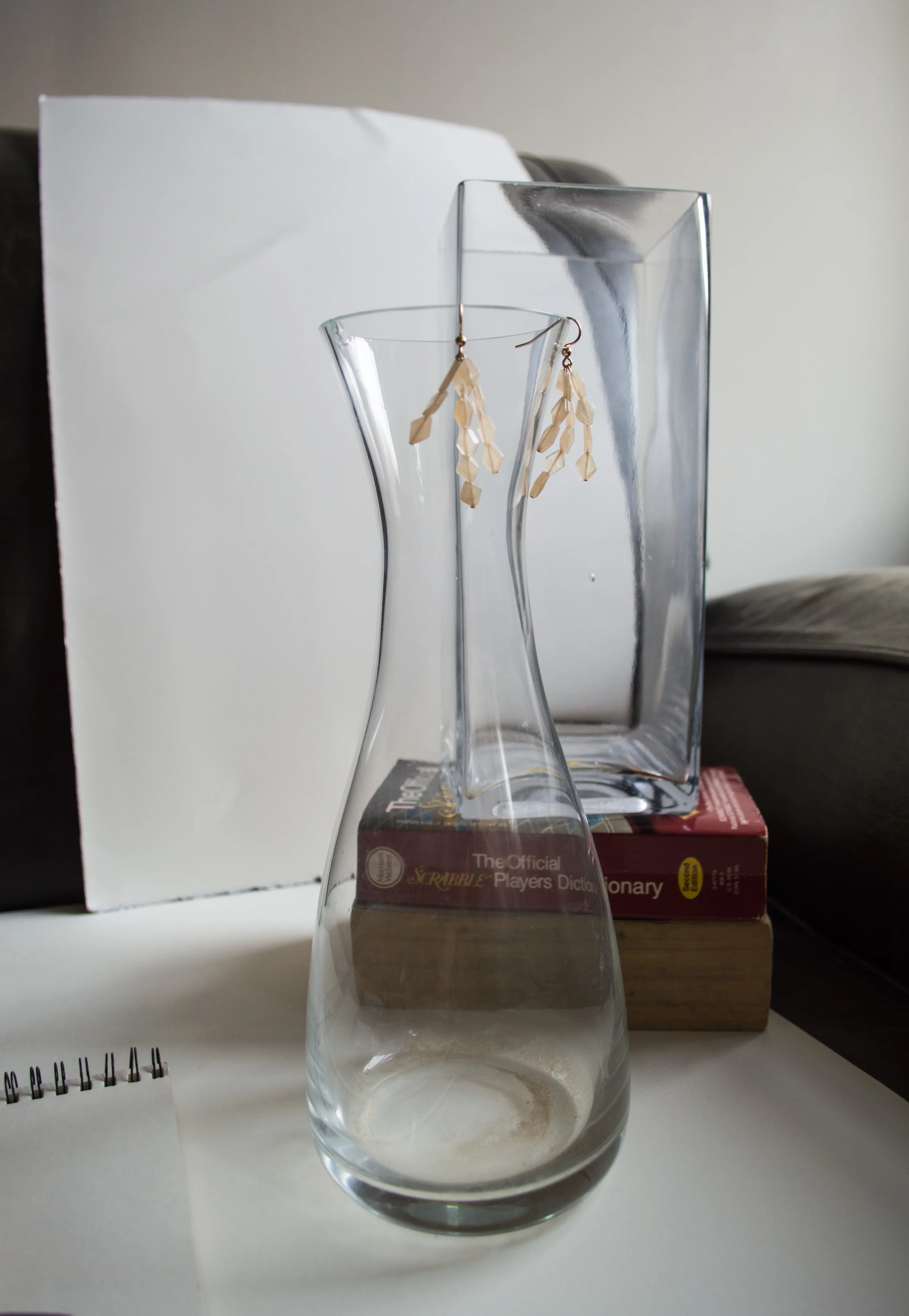 Using a low fstop blurs the background window, and using a glass vase abstracts it further while being visually less distracting than the black earring holder.