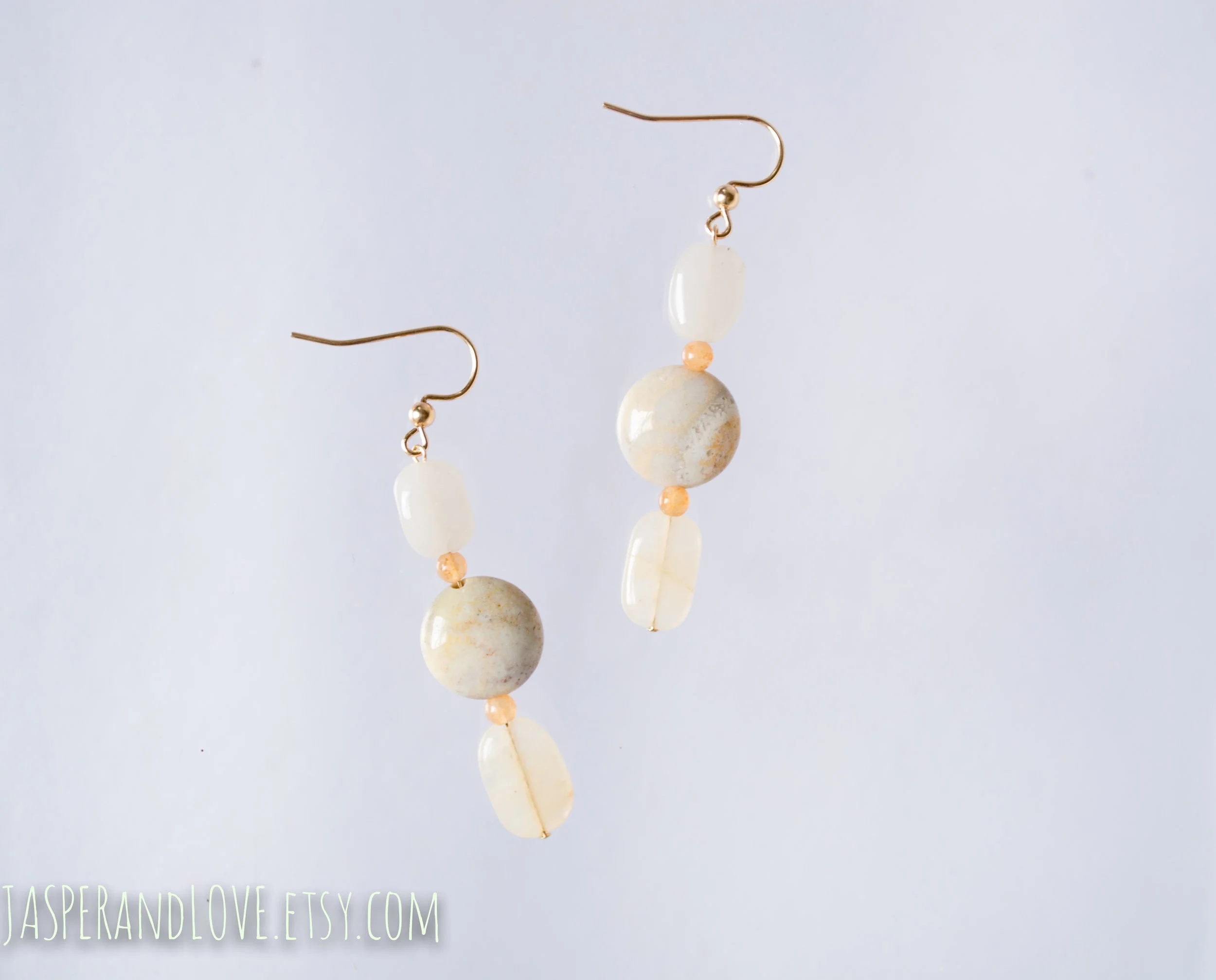 Summer Rose Many thanks to my Mom for helping me name these and Jadine. You'll see I'm bringing back the three-part earring, just like Shida at the start of this post. I like the movement this allows, plus the extra length, plus the reliability of wire rather than thread to achieve this effect. (Trust me, if I could figure out a reliable way to pull it off with thread, I'd do that too...) We'll see if this cream quartz / garnet combo resurfaces later, I'm a bit fascinated.